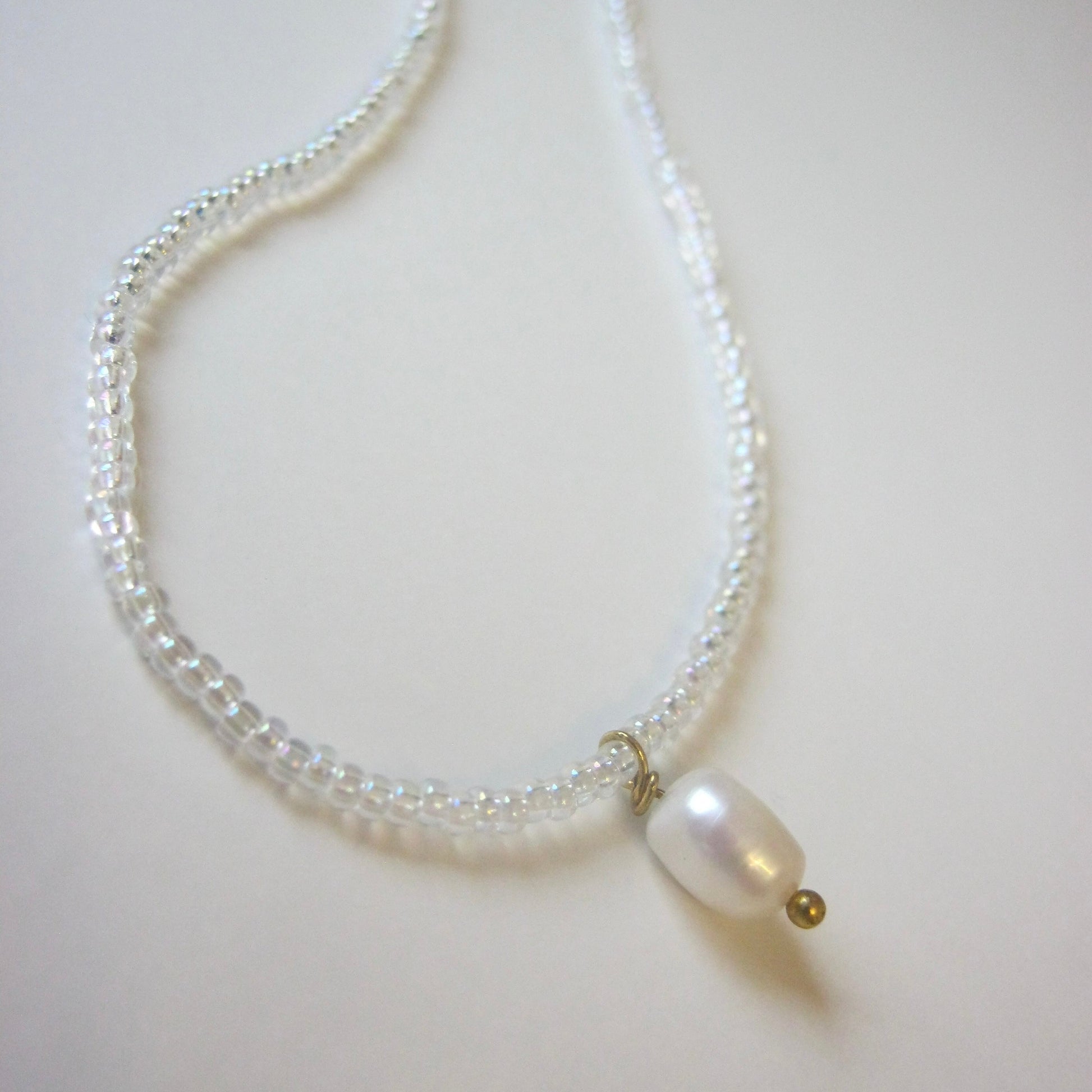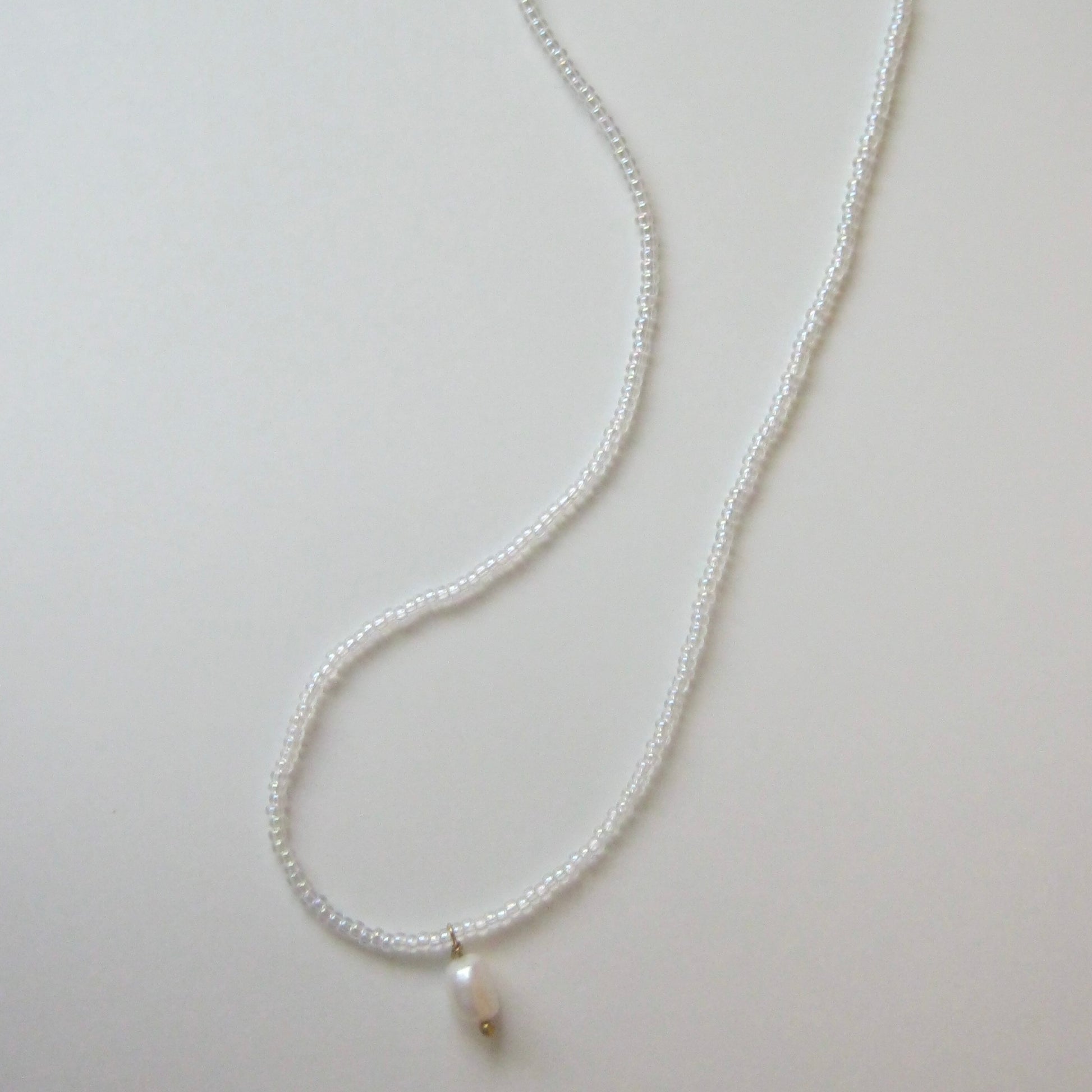 The Lorelai Necklace is a dainty piece made with iridescent beads and a freshwater pearl pendant.