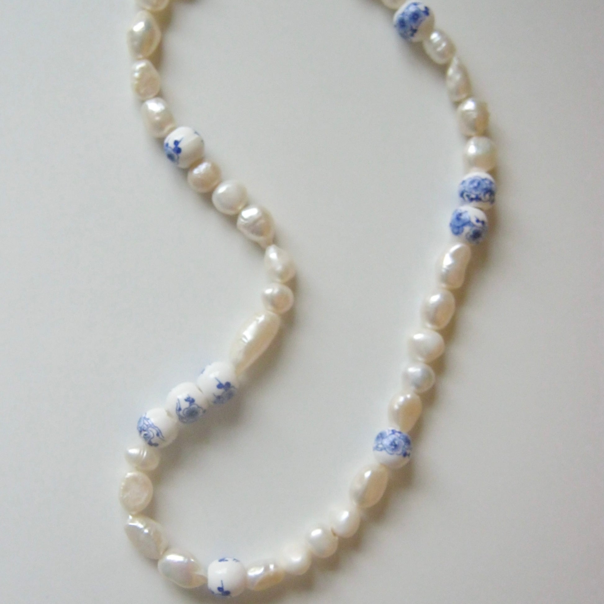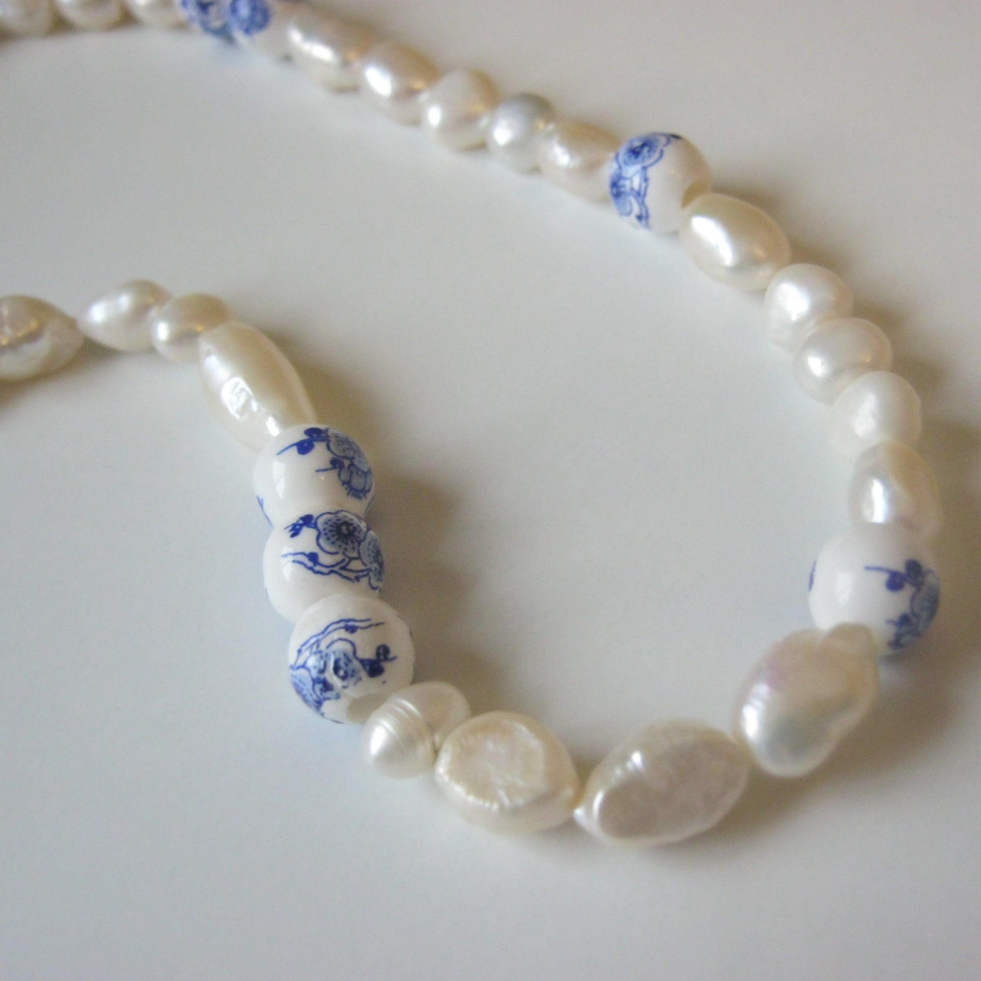 The Mia Necklace is made with real freshwater pearls and blue ceramic beads. Shop the matching Daisy Bracelet.