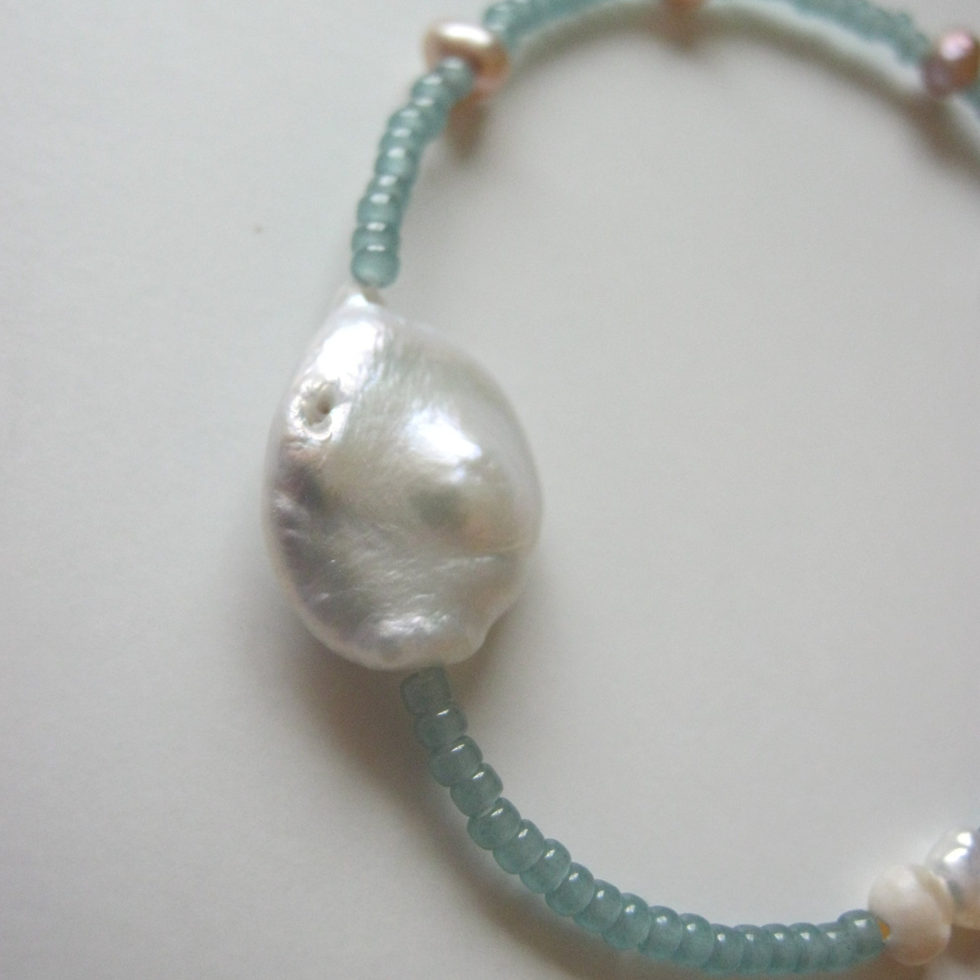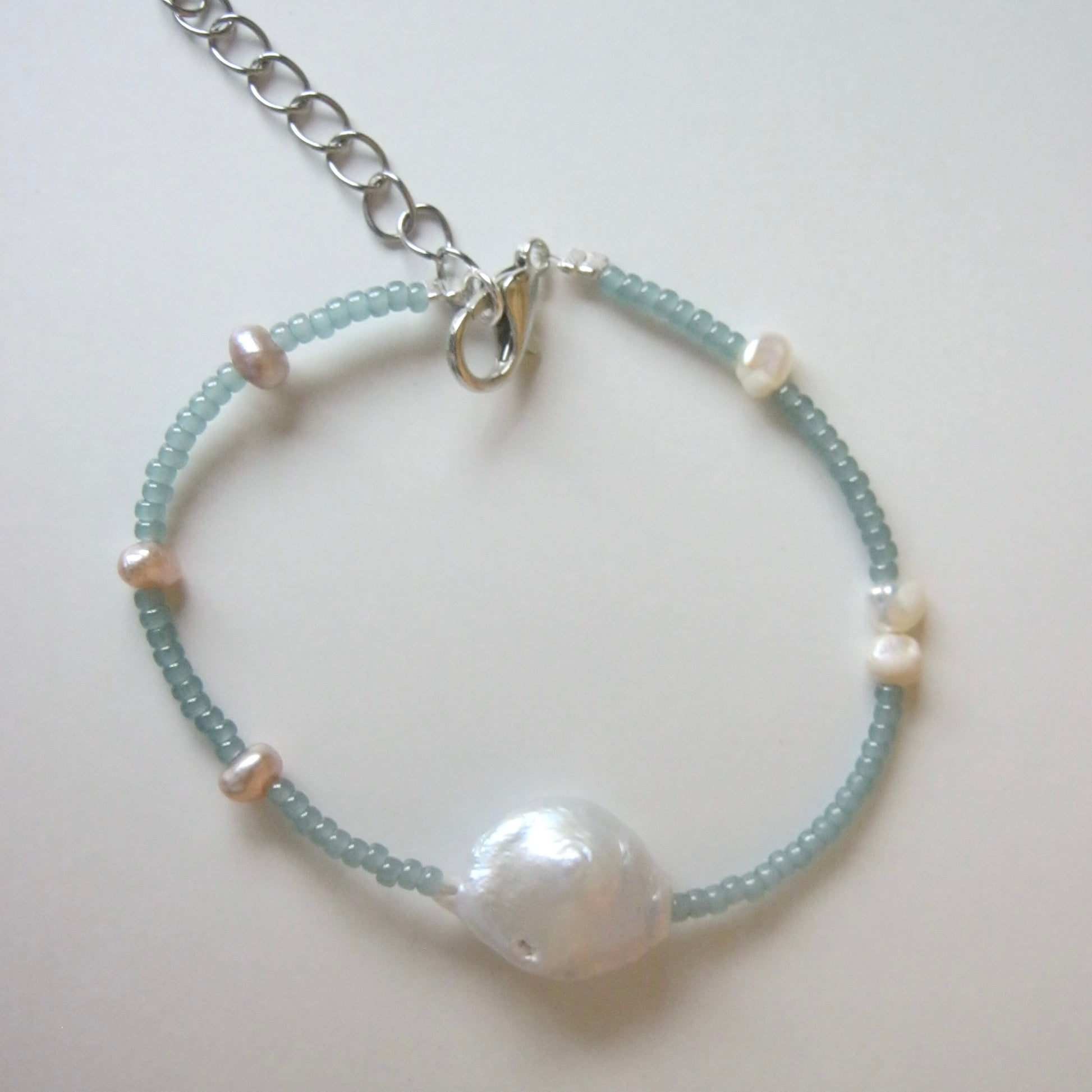 The Phoebe Bracelet is made with real freshwater pearls and beads in the shade Deep Ocean.