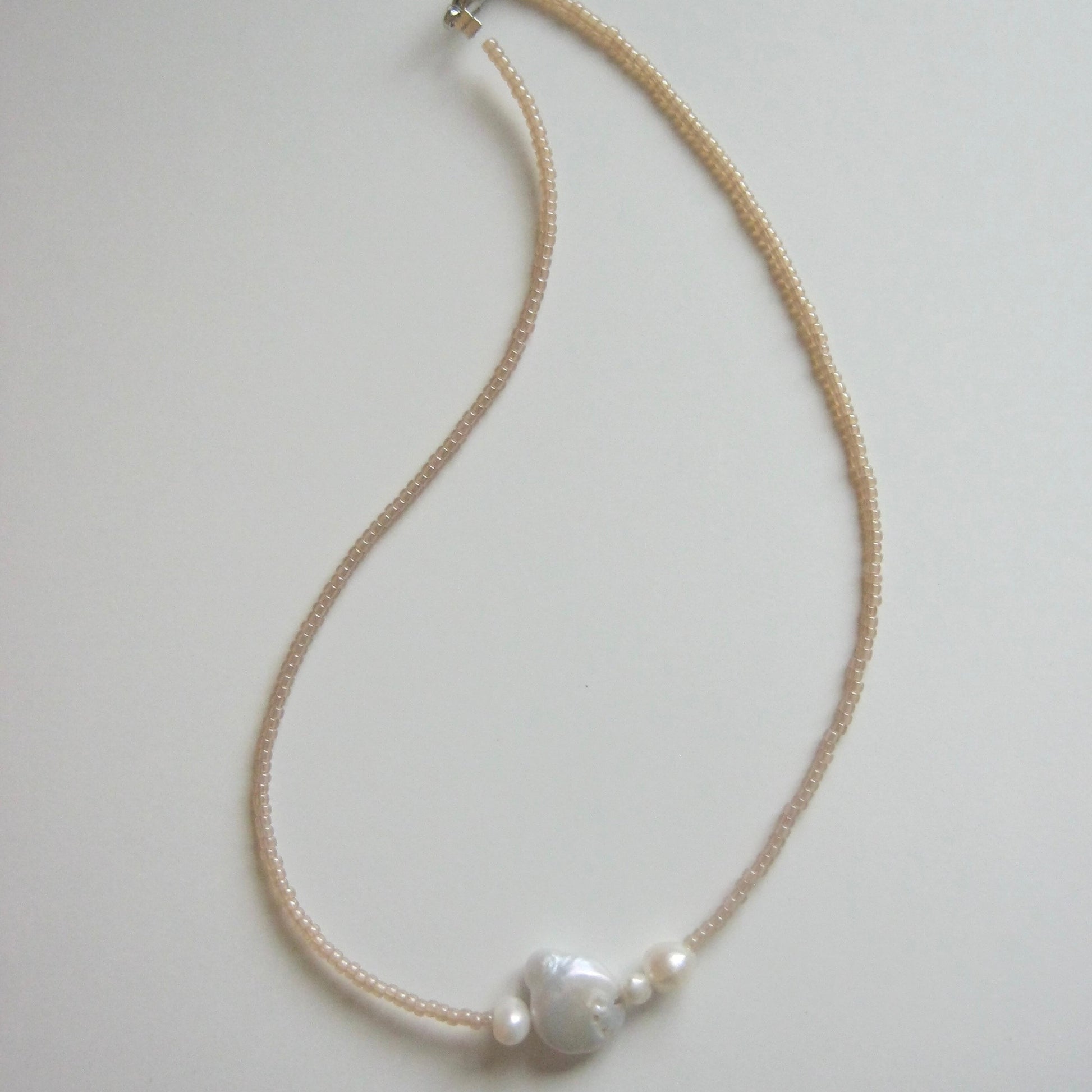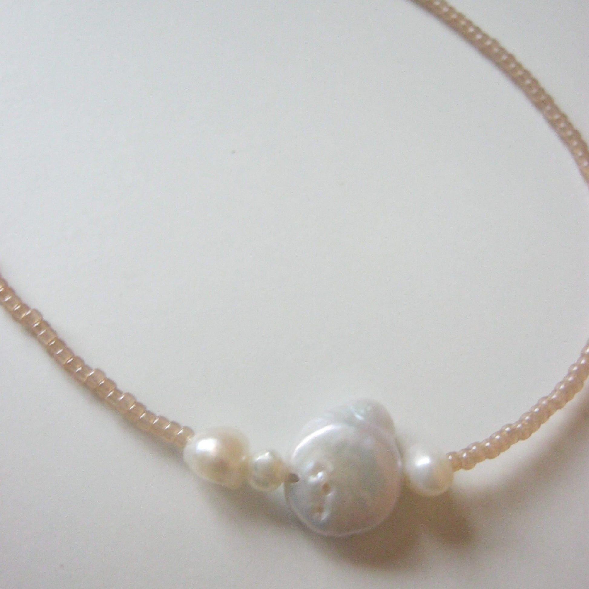 The Sophia Necklace is a dainty piece made with real freshwater pearls and beads in the shade Champagne Pop. Made to stack, but can also be worn alone.