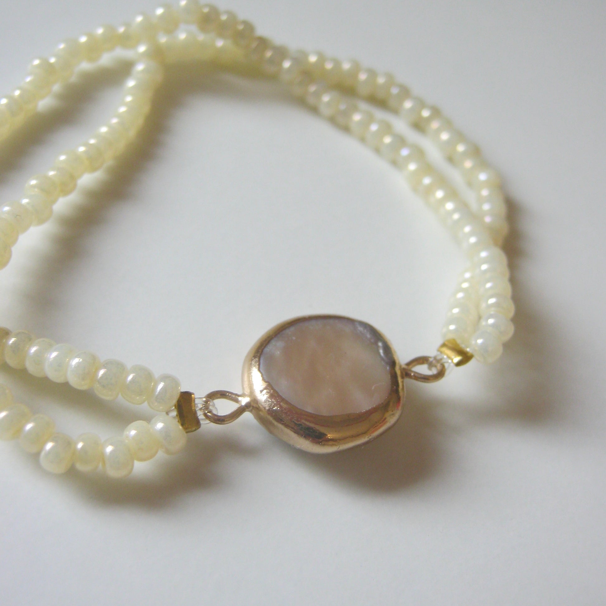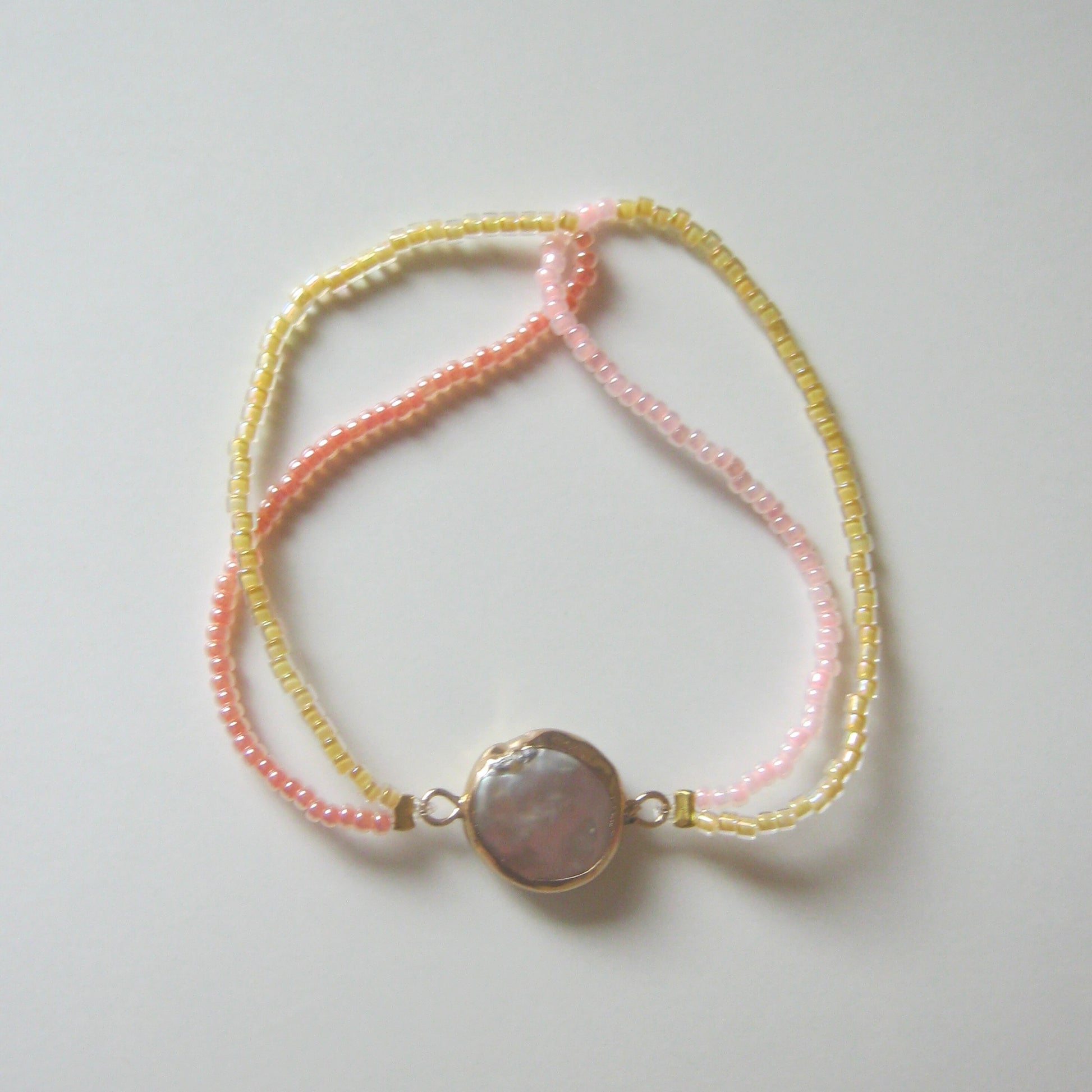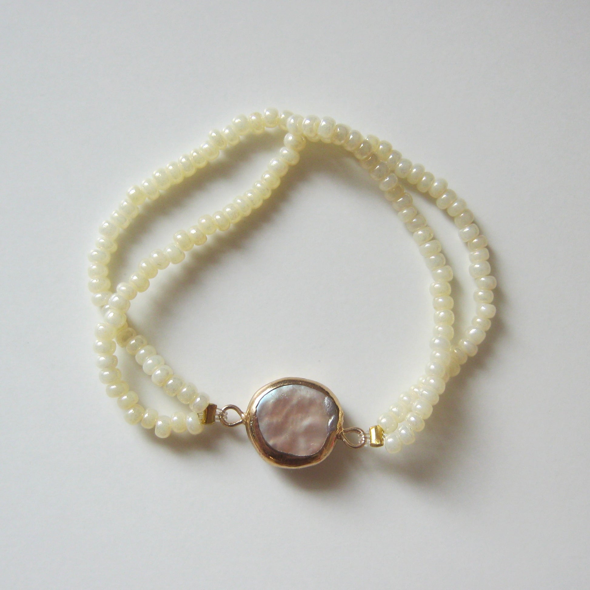 This double-beaded bracelet is handmade with a real freshwater pearl in the center. Meant to stack but can also be worn alone.