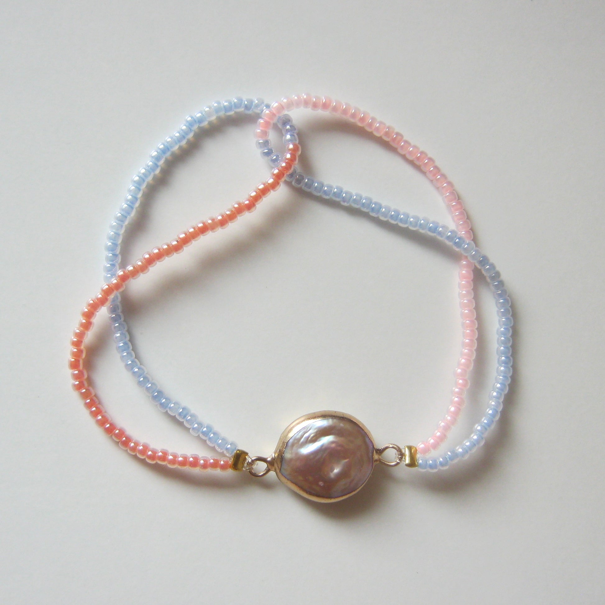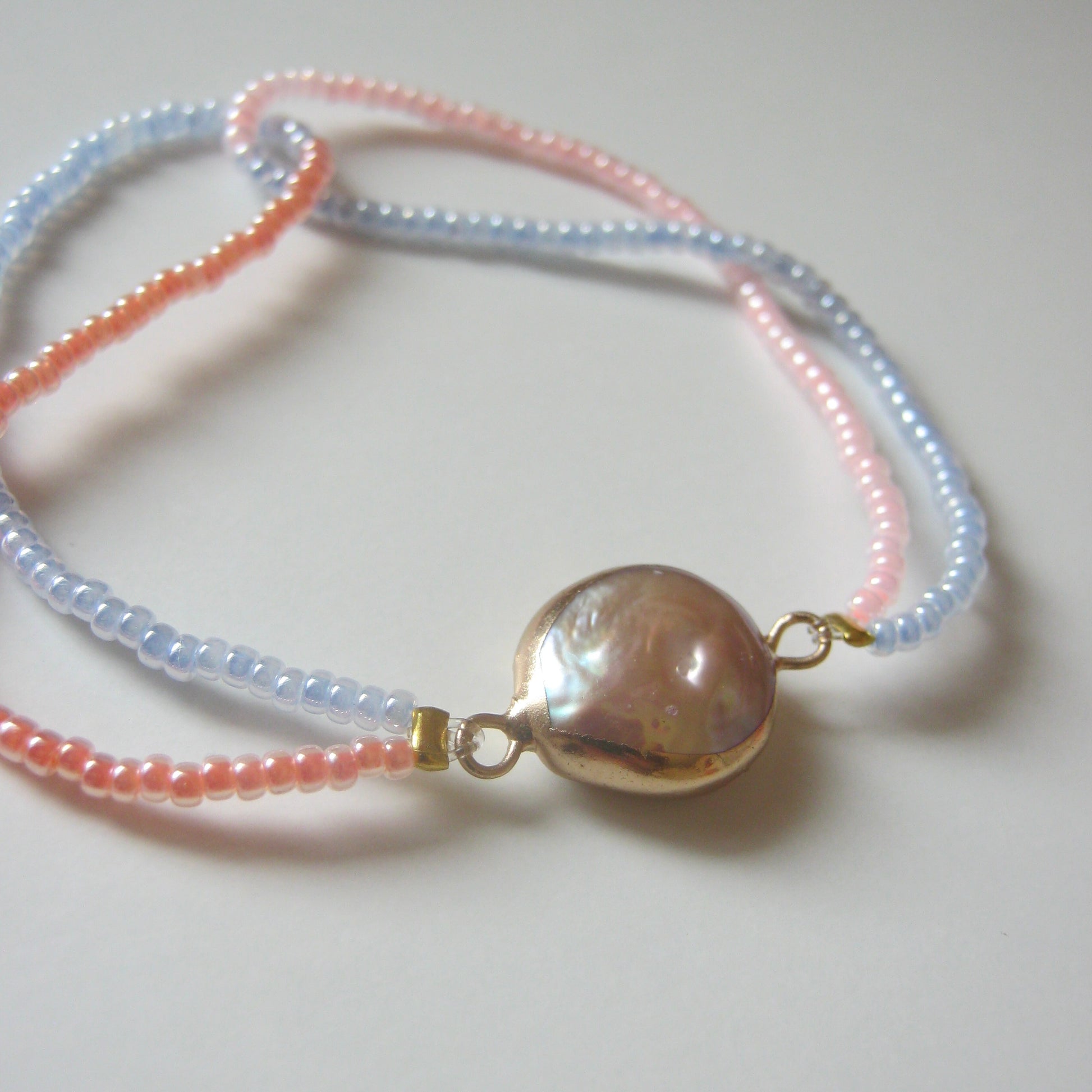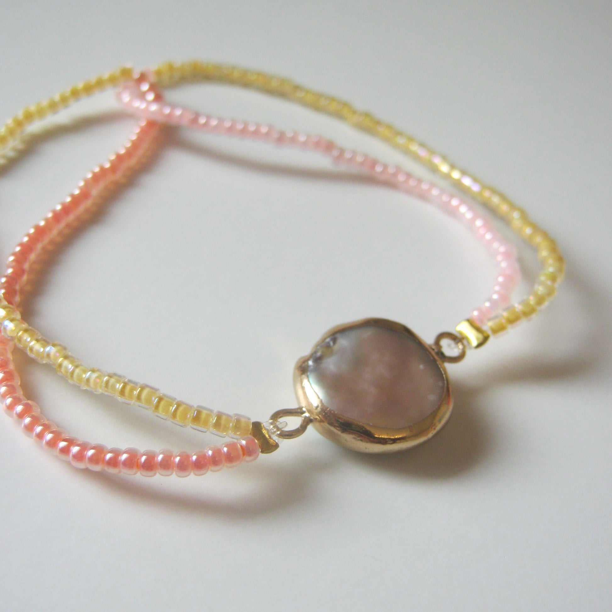 This double-beaded bracelet is handmade with a real freshwater pearl in the center. Meant to stack but can also be worn alone.